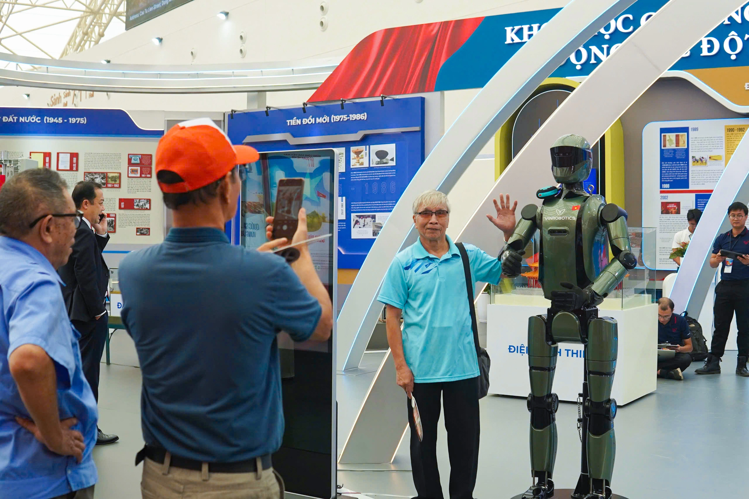 Ở khu vực của Bộ Khoa học và Công nghệ, nhiều người vây quanh robot hình người của VinMotion. Cỗ máy cao gần 1,7 m, biết đi lại, vẫy tay, trò chuyện bằng tiếng Việt. Một nhóm học sinh cười khúc khích khi robot gọi tên từng bạn.