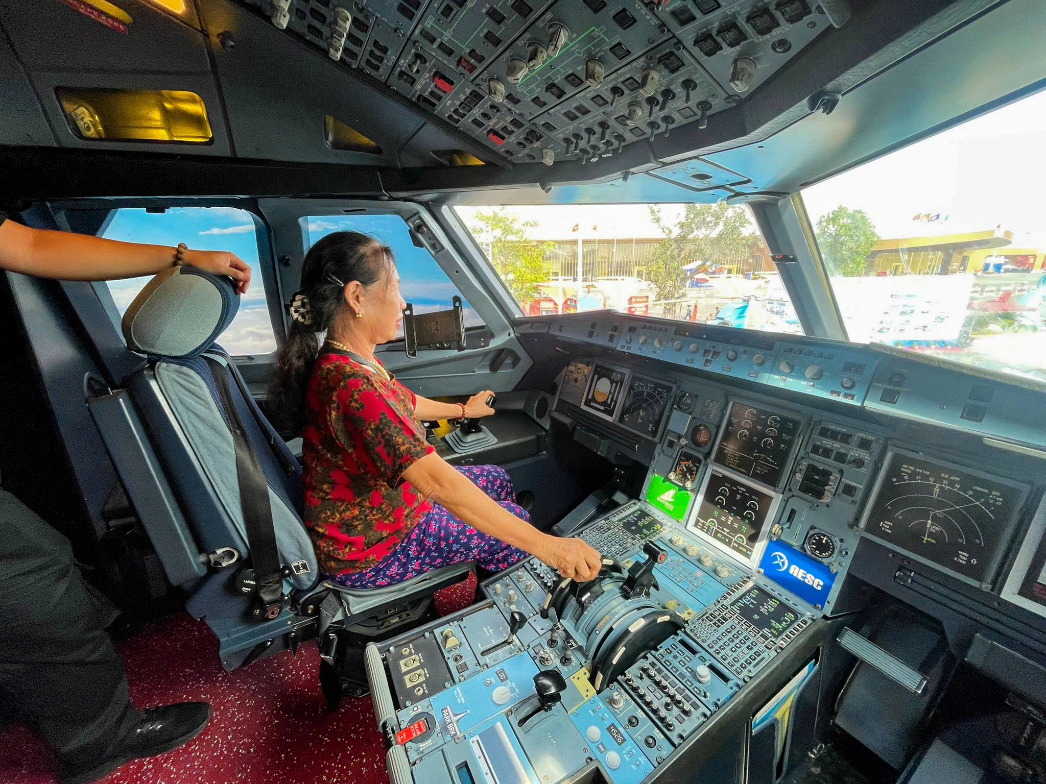 Bên ngoài tòa nhà Kim Quy, ở khu triển lãm "Khát vọng bầu trời", bà Trịnh Thị Thức, 75 tuổi, lần đầu ngồi vào ghế lái Airbus A320. Bà run run cầm cần điều khiển, thử tự mình làm phi công trong ít phút, dù chưa từng một lần đi máy bay trong đời.
