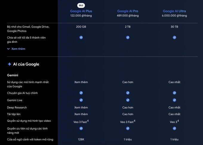 Người dùng tại Việt Nam hiện có ba lựa chọn gồm AI Plus giá 122.000 đồng, AI Pro 489.000 đồng và AI Ultra Pro 6.000.000 đồng mỗi tháng.