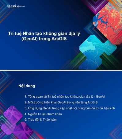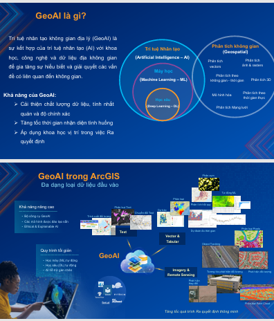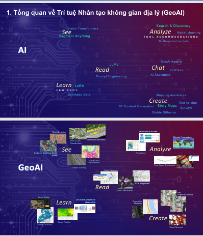 GeoAI (Geospatial Artificial Intelligence) là sự kết hợp giữa: Công nghệ địa không gian (GIS, viễn thám, GPS, bản đồ số, dữ liệu vệ tinh…) và Trí tuệ nhân tạo (machine learning, deep learning, computer vision…)