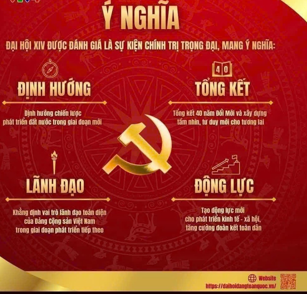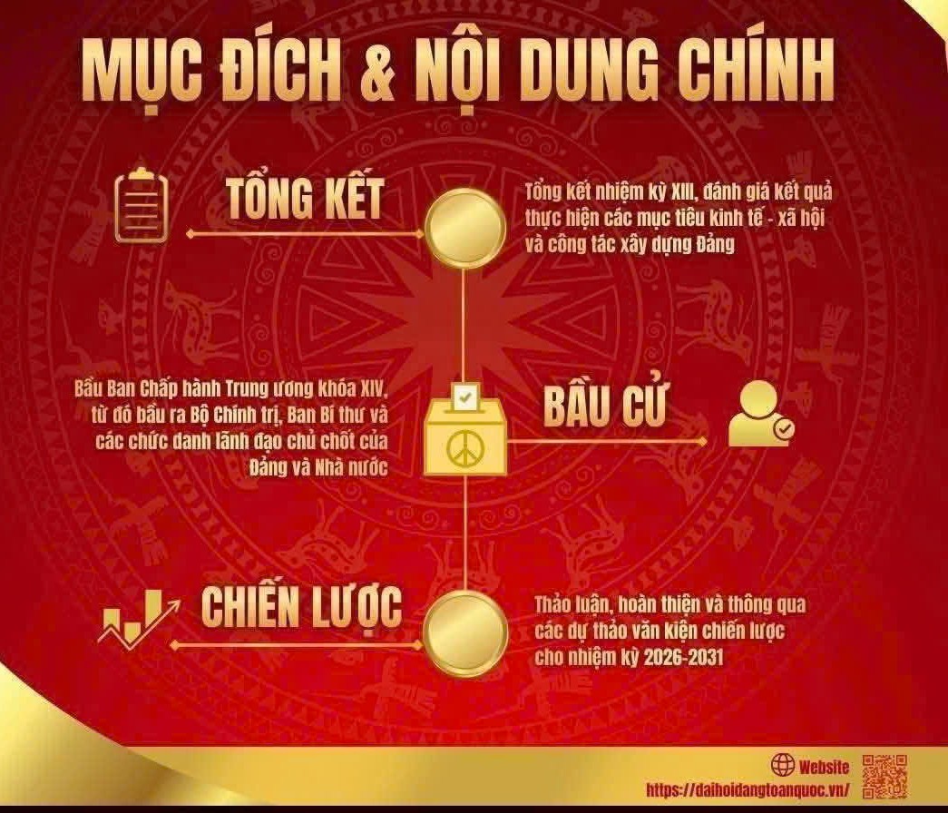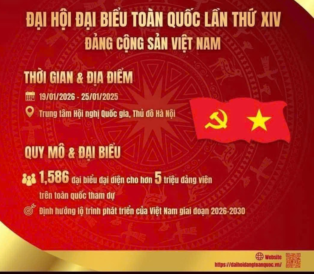 Cập nhật: 22/01/2026Đại hội XIV của Đảng diễn ra từ ngày 19/1 đến 25/1/2026. Đại hội là sự kiện chính trị đặc biệt quan trọng, đánh dấu bước chuyển chiến lược trong tư duy, tầm nhìn và quyết tâm của toàn Đảng, toàn dân, toàn quân trong hiện thực hóa các mục tiêu phát triển đất nước đến năm 2030, đưa Việt Nam tự tin tiến vào kỷ nguyên vươn mình của dân tộc.